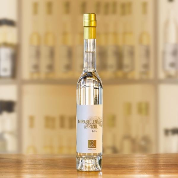 Mirabellenbrand: besteht aus einer sonnengereiften, gelben Frucht, mit genau dem richtigen Maß an Fruchtigkeit. Es ist eine Freude zu beobachten, wie die Energie der Sonne direkt ins Glas fließt; seine Klarheit, der feine Duft, das bonbonartige, süßliche, würzig-feine Bittermandelaroma zieht jeden Genießer in seinen Bann.